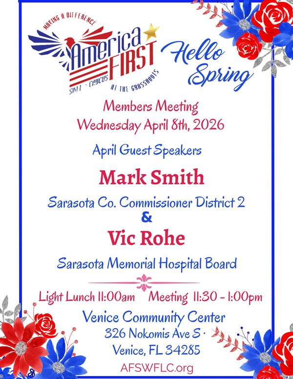 The America First Southwest Florida Caucus is pleased to host two outstanding speakers for our April meeting: Sarasota County Commissioner Mark Smith (District 2) and Sarasota Memorial Hospital Board member Vic Rohe.
